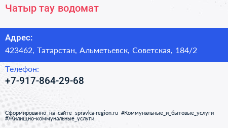Чатыр-тау, водомат по адресу 423462, Татарстан, Альметьевск, Советская, 184/2 в дальнейшем Организация, размещена в следующих категориях: