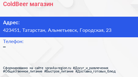 ColdBeer, магазин по адресу 423451, Татарстан, Альметьевск, Городская, 23 в дальнейшем Организация, размещена в следующих категориях: