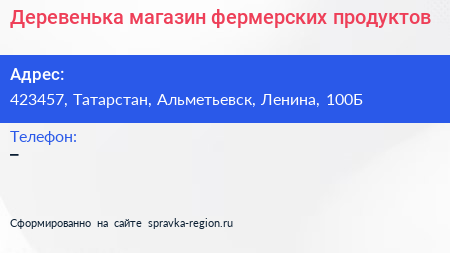 Деревенька, магазин фермерских продуктов по адресу 423457, Татарстан, Альметьевск, Ленина, 100Б в дальнейшем Организация, размещена в следующих категориях:
