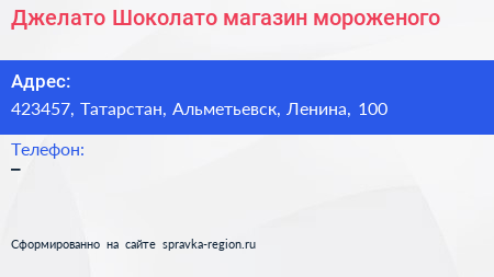 Джелато Шоколато, магазин мороженого по адресу 423457, Татарстан, Альметьевск, Ленина, 100 в дальнейшем Организация, размещена в следующих категориях:
