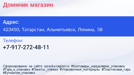 Доминик, магазин по адресу 423450, Татарстан, Альметьевск, Ленина, 58 в дальнейшем Организация, размещена в следующих категориях: