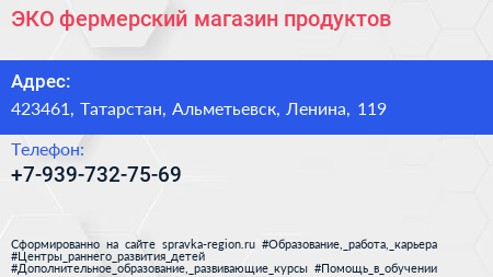 ЭКО, фермерский магазин продуктов по адресу 423461, Татарстан, Альметьевск, Ленина, 119 в дальнейшем Организация, размещена в следующих категориях: