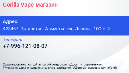 Gorilla Vape, магазин по адресу 423457, Татарстан, Альметьевск, Ленина, 100 ст2 в дальнейшем Организация, размещена в следующих категориях: