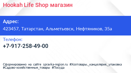 Hookah Life Shop, магазин по адресу 423457, Татарстан, Альметьевск, Нефтяников, 35а в дальнейшем Организация, размещена в следующих категориях: