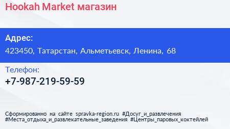 Hookah Market, магазин по адресу 423450, Татарстан, Альметьевск, Ленина, 68 в дальнейшем Организация, размещена в следующих категориях: