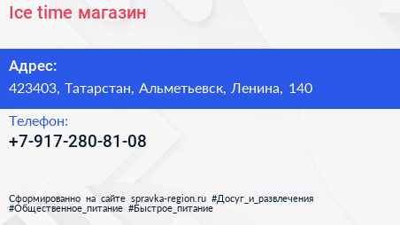 Ice time, магазин по адресу 423403, Татарстан, Альметьевск, Ленина, 140 в дальнейшем Организация, размещена в следующих категориях: