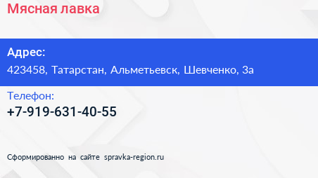 Мясная лавка по адресу 423458, Татарстан, Альметьевск, Шевченко, 3а в дальнейшем Организация, размещена в следующих категориях: