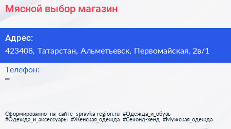 Мясной выбор, магазин по адресу 423408, Татарстан, Альметьевск, Первомайская, 2в/1 в дальнейшем Организация, размещена в следующих категориях: