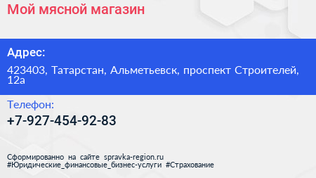 Мой мясной, магазин по адресу 423403, Татарстан, Альметьевск, проспект Строителей, 12а в дальнейшем Организация, размещена в следующих категориях: