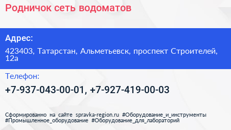 Родничок, сеть водоматов по адресу 423403, Татарстан, Альметьевск, проспект Строителей, 12а в дальнейшем Организация, размещена в следующих категориях: