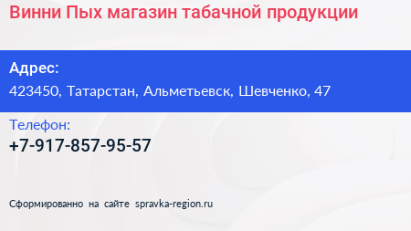 Винни Пых, магазин табачной продукции по адресу 423450, Татарстан, Альметьевск, Шевченко, 47 в дальнейшем Организация, размещена в следующих категориях: