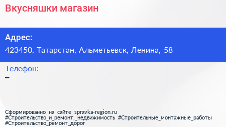 Вкусняшки, магазин по адресу 423450, Татарстан, Альметьевск, Ленина, 58 в дальнейшем Организация, размещена в следующих категориях: