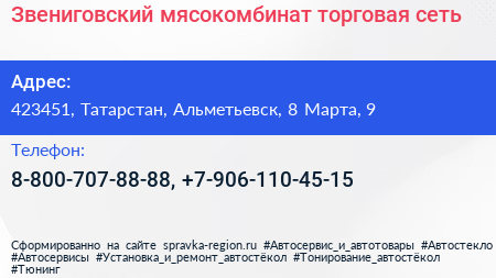 Звениговский мясокомбинат, торговая сеть по адресу 423451, Татарстан, Альметьевск, 8 Марта, 9 в дальнейшем Организация, размещена в следующих категориях: