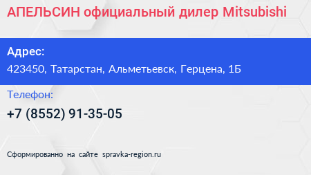 АПЕЛЬСИН, официальный дилер Mitsubishi по адресу 423450, Татарстан, Альметьевск, Герцена, 1Б в дальнейшем Организация, размещена в следующих категориях:
