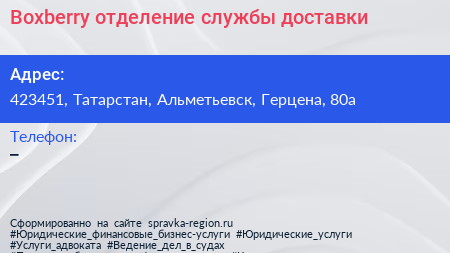 Boxberry, отделение службы доставки по адресу 423451, Татарстан, Альметьевск, Герцена, 80а в дальнейшем Организация, размещена в следующих категориях: