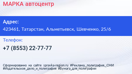 МАРКА, автоцентр по адресу 423461, Татарстан, Альметьевск, Шевченко, 25/6 в дальнейшем Организация, размещена в следующих категориях: