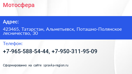 Мотосфера по адресу 423465, Татарстан, Альметьевск, Поташно-Полянское лесничество, 30 в дальнейшем Организация, размещена в следующих категориях: