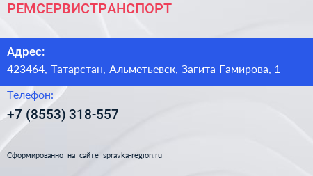 РЕМСЕРВИСТРАНСПОРТ по адресу 423464, Татарстан, Альметьевск, Загита Гамирова, 1 в дальнейшем Организация, размещена в следующих категориях: