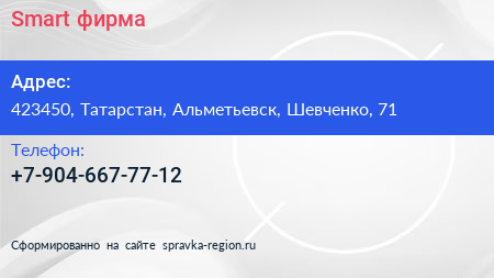 Smart, фирма по адресу 423450, Татарстан, Альметьевск, Шевченко, 71 в дальнейшем Организация, размещена в следующих категориях: