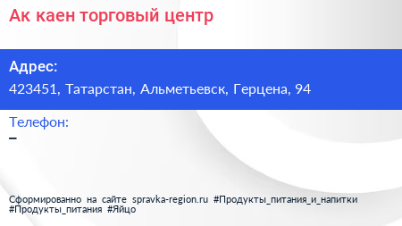 Ак каен, торговый центр по адресу 423451, Татарстан, Альметьевск, Герцена, 94 в дальнейшем Организация, размещена в следующих категориях:
