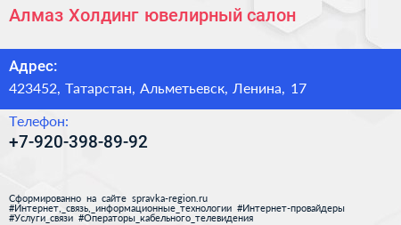 Алмаз-Холдинг, ювелирный салон по адресу 423452, Татарстан, Альметьевск, Ленина, 17 в дальнейшем Организация, размещена в следующих категориях: