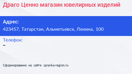 Драго & Ценно, магазин ювелирных изделий по адресу 423457, Татарстан, Альметьевск, Ленина, 100 в дальнейшем Организация, размещена в следующих категориях: