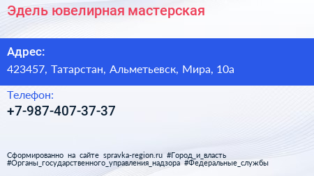 Эдель, ювелирная мастерская по адресу 423457, Татарстан, Альметьевск, Мира, 10а в дальнейшем Организация, размещена в следующих категориях: