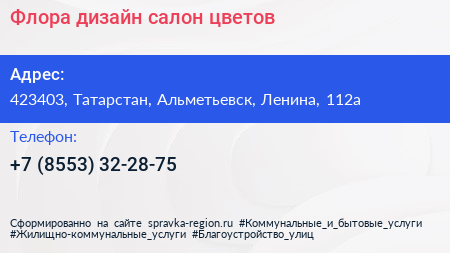 Флора-дизайн, салон цветов по адресу 423403, Татарстан, Альметьевск, Ленина, 112а в дальнейшем Организация, размещена в следующих категориях:
