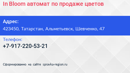 In Bloom, автомат по продаже цветов по адресу 423450, Татарстан, Альметьевск, Шевченко, 47 в дальнейшем Организация, размещена в следующих категориях: