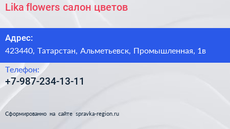 Lika flowers, салон цветов по адресу 423440, Татарстан, Альметьевск, Промышленная, 1в в дальнейшем Организация, размещена в следующих категориях: