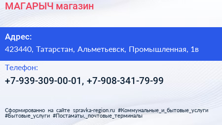 МАГАРЫЧ, магазин по адресу 423440, Татарстан, Альметьевск, Промышленная, 1в в дальнейшем Организация, размещена в следующих категориях: