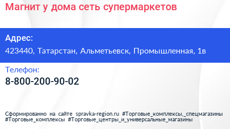 Магнит у дома, сеть супермаркетов по адресу 423440, Татарстан, Альметьевск, Промышленная, 1в в дальнейшем Организация, размещена в следующих категориях: