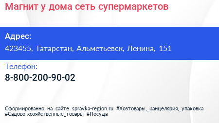 Магнит у дома, сеть супермаркетов по адресу 423455, Татарстан, Альметьевск, Ленина, 151 в дальнейшем Организация, размещена в следующих категориях:
