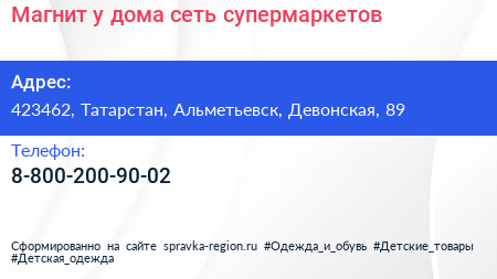 Магнит у дома, сеть супермаркетов по адресу 423462, Татарстан, Альметьевск, Девонская, 89 в дальнейшем Организация, размещена в следующих категориях: