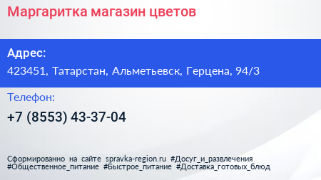 Маргаритка, магазин цветов по адресу 423451, Татарстан, Альметьевск, Герцена, 94/3 в дальнейшем Организация, размещена в следующих категориях: