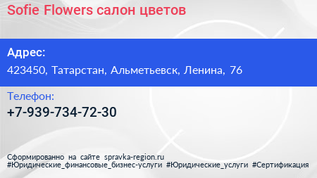 Sofie Flowers, салон цветов по адресу 423450, Татарстан, Альметьевск, Ленина, 76 в дальнейшем Организация, размещена в следующих категориях:
