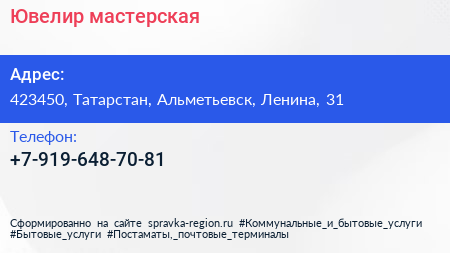 Ювелир, мастерская по адресу 423450, Татарстан, Альметьевск, Ленина, 31 в дальнейшем Организация, размещена в следующих категориях: