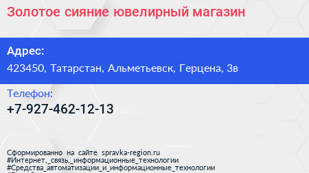Золотое сияние, ювелирный магазин по адресу 423450, Татарстан, Альметьевск, Герцена, 3в в дальнейшем Организация, размещена в следующих категориях: