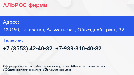 АЛЬРОС, фирма по адресу 423450, Татарстан, Альметьевск, Объездной тракт, 39 в дальнейшем Организация, размещена в следующих категориях: