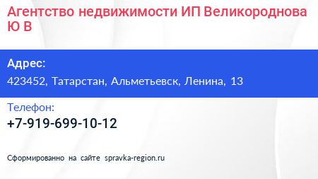 Агентство недвижимости, ИП Великороднова Ю.В. по адресу 423452, Татарстан, Альметьевск, Ленина, 13 в дальнейшем Организация, размещена в следующих категориях: