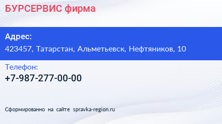 БУРСЕРВИС, фирма по адресу 423457, Татарстан, Альметьевск, Нефтяников, 10 в дальнейшем Организация, размещена в следующих категориях: