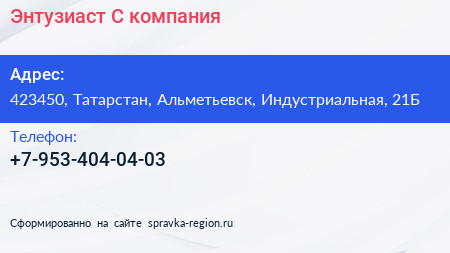 Энтузиаст-С, компания по адресу 423450, Татарстан, Альметьевск, Индустриальная, 21Б в дальнейшем Организация, размещена в следующих категориях: