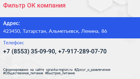 Фильтр`ОК, компания по адресу 423450, Татарстан, Альметьевск, Ленина, 86 в дальнейшем Организация, размещена в следующих категориях: