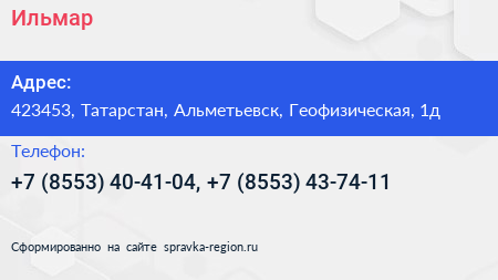 Ильмар+ по адресу 423453, Татарстан, Альметьевск, Геофизическая, 1д в дальнейшем Организация, размещена в следующих категориях: