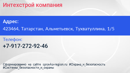 Интехстрой, компания по адресу 423464, Татарстан, Альметьевск, Тухватуллина, 1/5 в дальнейшем Организация, размещена в следующих категориях: