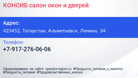 КОНСИБ, салон окон и дверей по адресу 423452, Татарстан, Альметьевск, Ленина, 34 в дальнейшем Организация, размещена в следующих категориях: