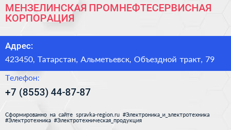 МЕНЗЕЛИНСКАЯ ПРОМНЕФТЕСЕРВИСНАЯ КОРПОРАЦИЯ по адресу 423450, Татарстан, Альметьевск, Объездной тракт, 79 в дальнейшем Организация, размещена в следующих категориях: