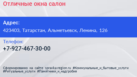 Отличные окна, салон по адресу 423403, Татарстан, Альметьевск, Ленина, 126 в дальнейшем Организация, размещена в следующих категориях: