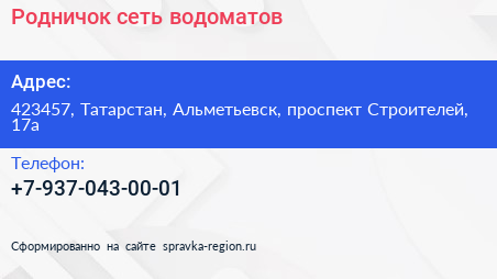 Родничок, сеть водоматов по адресу 423457, Татарстан, Альметьевск, проспект Строителей, 17а в дальнейшем Организация, размещена в следующих категориях: