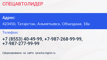 СПЕЦАВТОЛИДЕР по адресу 423450, Татарстан, Альметьевск, Объездная, 18а в дальнейшем Организация, размещена в следующих категориях: